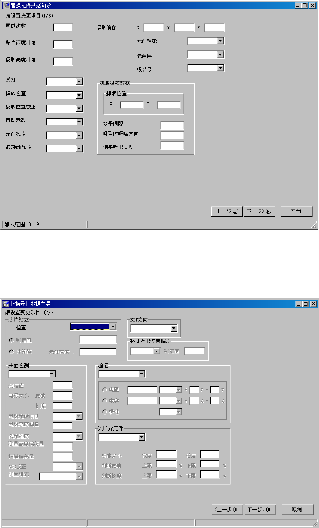 第 1 部 基本篇 第 4 章 制作生产程序 4-102 2) 设定替换值 ① 显示元件数据附加信息选项卡画面。 请输入需要变更的数据,单击“下一步”。 图4-5-1-1-8 替换设定画面(1) ② 显示元件数据检查选项卡画面。 输入需要变更的元件数据,单击“下一步”。 图4-5-1-1-9 替换设定画面(2)