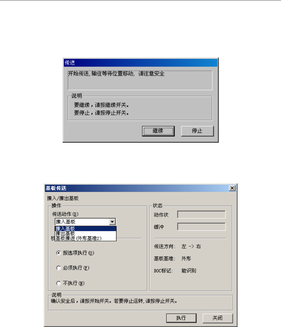 第 1 部 基本篇 第 4 章 制作生产程序 4-144 4-5-4-1 传送 (1)基板搬入/基板搬出 执行基板的搬入、搬出。 安全盖打开时,选择菜单后,为了将轴移动到安全位置,显示如下信息。 请确认安全后,按下 “继续” 。 图 4-5-4-1-1 确认安全 将轴移动到安全位置后,显示下列基板传送画面。 图 4-5-4-1-2 基板传送 ·按<开始>开关或“执行”进行传送。 ·要结束操作时,请按“关闭”。 ·在传送过程中…