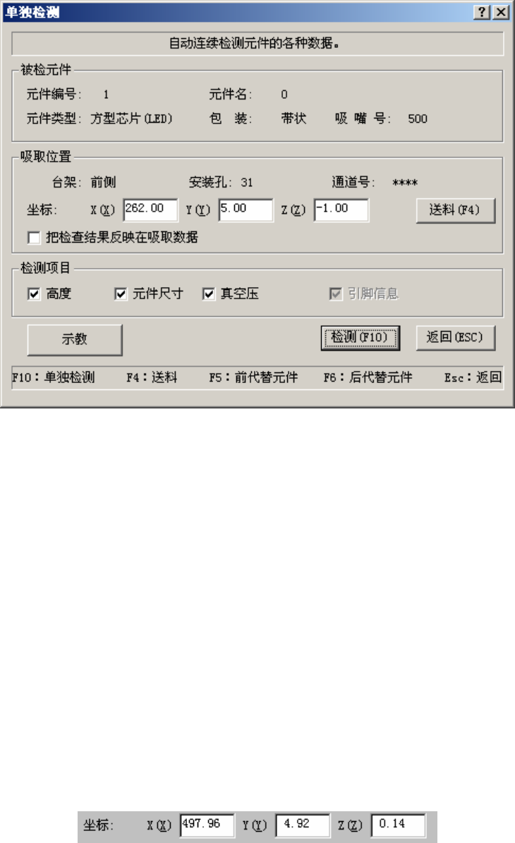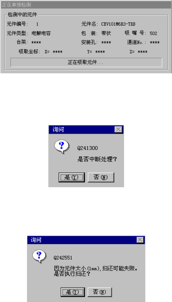 在单独检测过程中,会显示如下画面。显示正在进行单独检测的元件的内容及吸取位置,