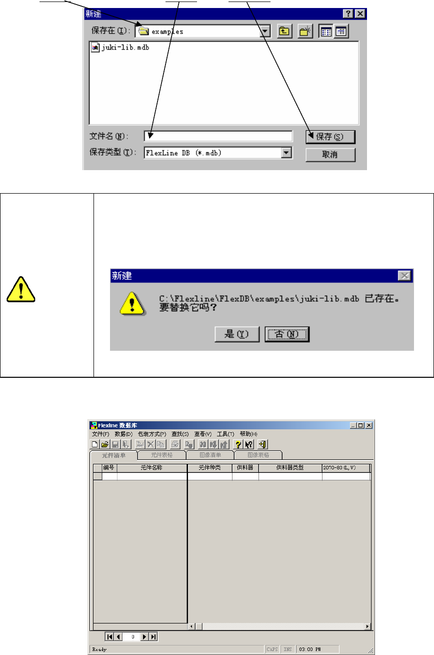 第 1 部 基本篇 第 5 章 数据库 5-5 1) 空白 Flexline 数据库 选择后,显示下列输入新文件名画面。 选择保存在 的文件夹后,请输入文件名,单击“保存”。 在上述“输入新文件夹 名画面”中,切勿选择已有的数据 库文件。 选择已有的数据库文件 时,会显示下列信息。若在此单击 “是”后, 会把数据库文件的内容 全部删除掉。 敬请注意。 显示新建数据库画面。 注意