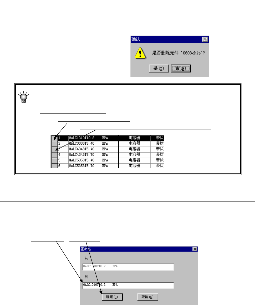 第 1 部 基本篇 第 5 章 数据库 5-13 5-1-3-5 删除 删除元件名。 <步骤> 1) 选择要删除的元件名,在菜单栏中单击“数据”/“删除” 。 2) 显示右图所示的询问提示信息。 单击“是”,即可删除。 删除多个元件的方法 : 先指定删除范围,再进行删除。 ●在数据库中指定范围的方法:以删除下列第 1 行至第 3 行为例。 首先,点击要删除此处的第一个元件。 然后按住 “Shift” 键,再单击此处的要删除的…