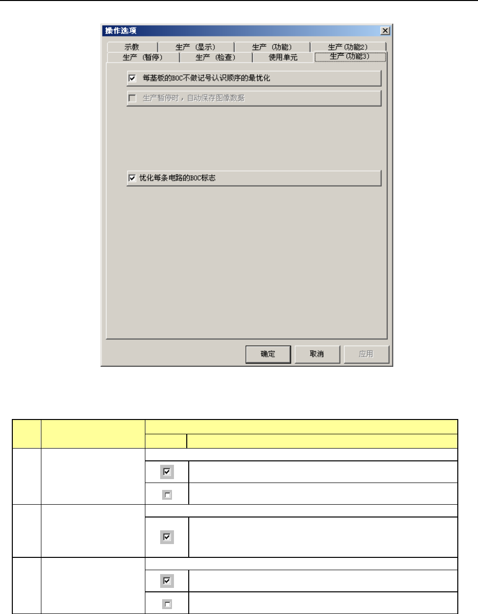 第 2 部 功能详解篇 第 6 章 操作选项 6-15 6-2-8 生产的功能 3 选项的设置 设置生产时的操作。 图6-2-8-1 生产功能 3 选项 表6-2-8-1 生产(功能 3)选项的设置项目及内容 内容 No. 项目 状态 动作及详细内容 生产时,变更识别 BOC 标记的顺序。 不进行每个基板的 BOC 标记识别顺序优化 1 每基板的 BOC 不做记号 认识顺序的最优化 进行每个基板的 BOC 标记识别顺序优化 设置元件剩余…