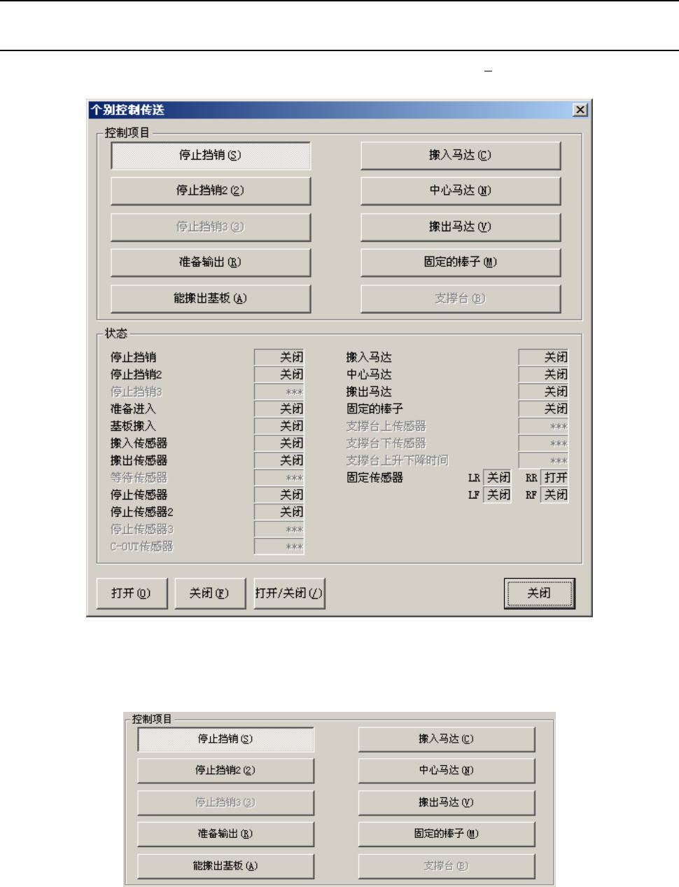 第 2 部 功能详解篇 第 8 章 手动控制 8-24 (2) 控制按钮 按动控制按钮,执行控制项目。 控制项目不同,控制按钮的显示也不同。 选择要控制的项目,选择 “打开(O )” 按钮、“关闭(F )” 按钮、 “打开/关闭(/ )”按钮或按下 “F3”键、 “F4”键、 “F5”键进行控制。选中支撑台时, 按“上 (U )”、“下 (D )”、 “ 上/ 下(/)”按钮进行控制。 (3) 状态显示 控制结束时显示各传感器、各单元的…