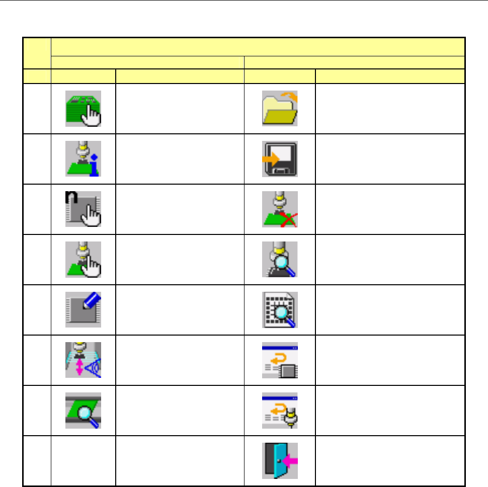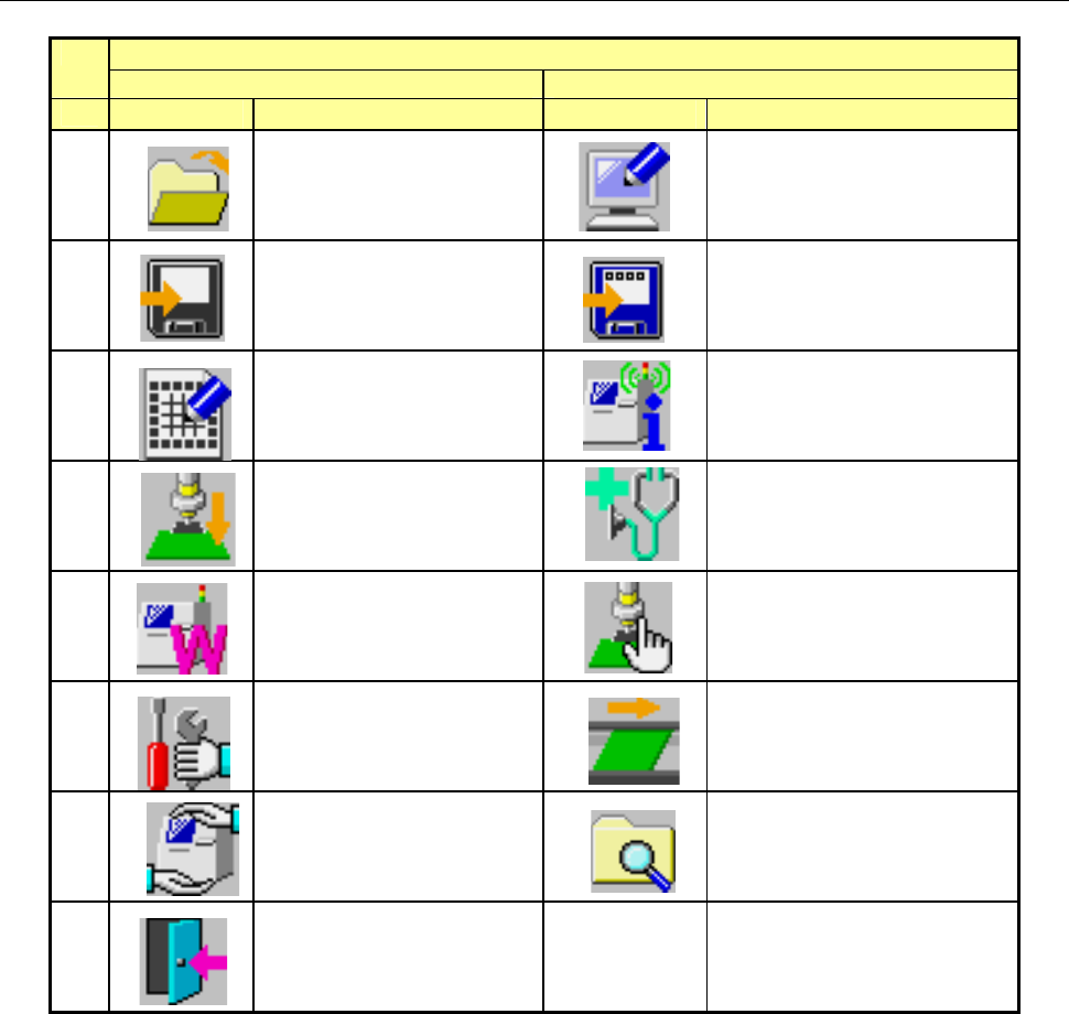 第 1 部 基本篇 第 1 章 设备概要 1-58 1-4-2-1 桌面 换页 1/2 2/2 No. 图标 名称 图标 名称 1 打开文件 读入生产程序文件。 数据库编辑 2 保存文件 保存生产程序。 另存为 命名生产程序文件名后保存。 3 编辑生产程序 装置运行信息 4 基板生产 自动校准 5 预热 操作选项 6 手动控制 通过 7 机器设置 文件管理 (Explorer) 8 退出 退出 JX-300LED 系统。