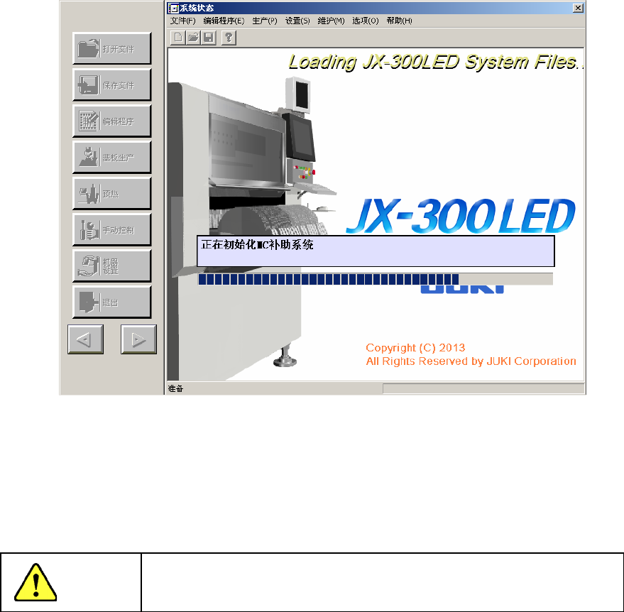 第 1 部 基本篇 第 2 章 生产 2-7 2) Windows XP 启动后 ,会显示下列启动画面。 图2-3-1-1 启动画面 3) 初始设置结束后,会显示主画面,在此基础上显示返回原点画面(参见图 2-3-1-3)。 单击“确定”按钮 ※1 ,可执行 返回原点 (图 2-3-1-4 )。 ※1:将画面上的箭头对准[确定]按钮后,按一次轨迹球左键。 警告 进行返回原点后,装置即刻开始运转。 为避免受伤,请绝对不要将手和头等伸入装置…