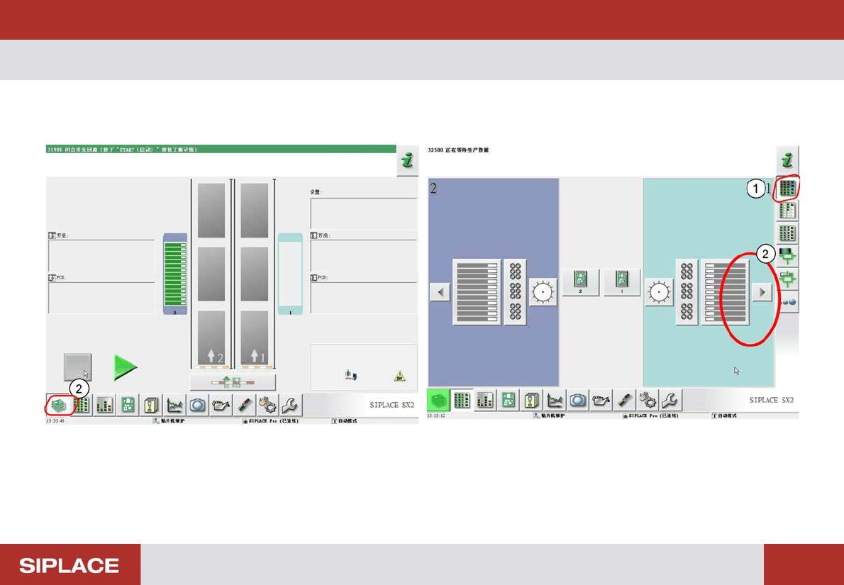 贴片机上的操作 移除和放回 SX2 转换料台 14 第 3 步: ▪ 按 “Stop pro duction (停止生产)” 按钮 (1) 第 4 步: 转换料台已经从贴片机移除, 图形用户界面 (GUI) (2)不 再显示料台图标。 如果转换料台已与贴片机连接 ,将显示料台图标 (1)