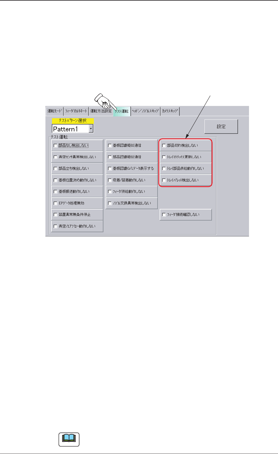 “運転方法”サブメニュー画面で[テスト運転]タブを押すと、以