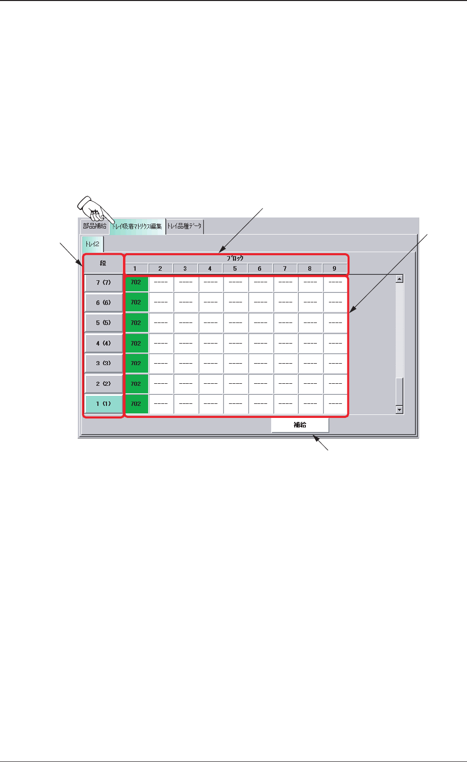 “部品補給”サブメニュー画面で[トレイ吸着マトリクス編集]タブ