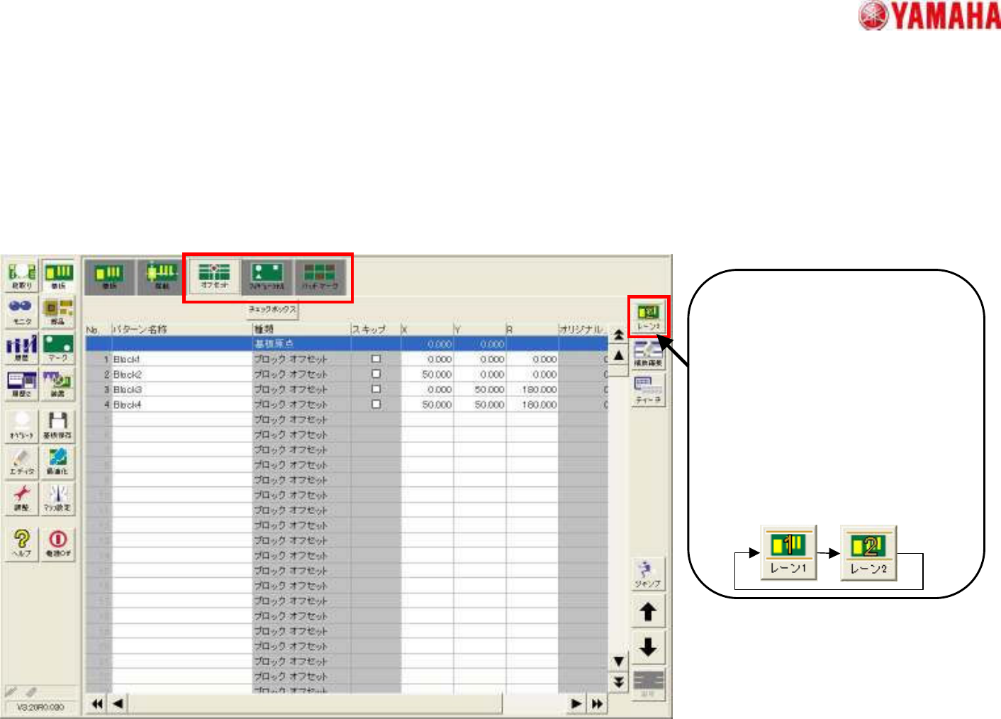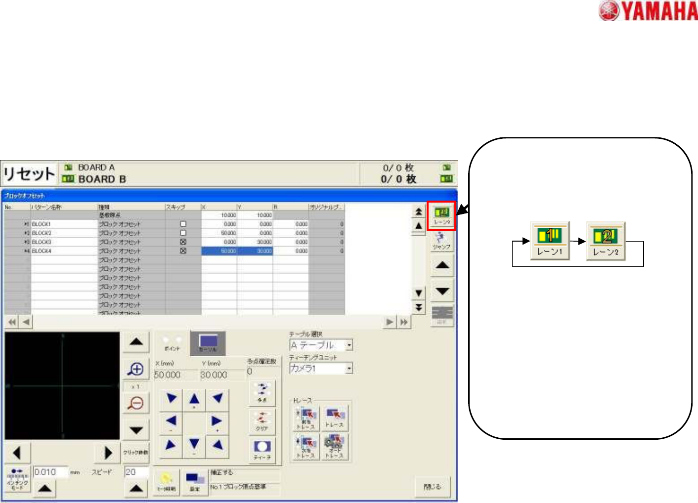 MDOC - SOFT50073 12 • ティーチ・トレース 画面 3.各画面詳細 【レーン切り替えボ タン】 各レーンの搭載・ブロック情報・フィデュー シャル・バッドマー ク情報 のティー チ・ト レースが可能です。 同一面前後流動を行う基板データの 場合にも、レーン切り替えボタンは表 示されます。 同一面前後流動を行う基板データを 使用した場合、 ブロック 情報・フィデュー シャル・バッドマー ク情報 は、 いずれか レーンで編集…