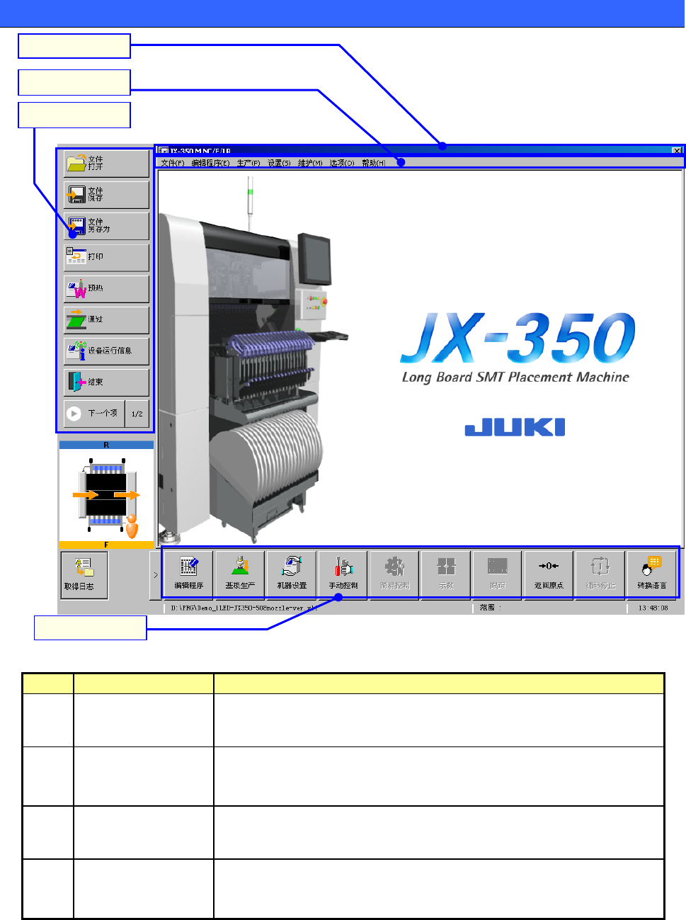 操作手册 2-3 操作画面的说明 No. 名 称 功能概要 ① 标题栏 窗口的标题。 显示的窗口功能不同,标题也不同。 ② 菜单栏 显示该窗口可使用的最高层次菜单。 (窗口不同,显示的菜单也不同。 ) 有些菜单,可以显示下拉菜单。 ③ 命令按钮 有一部分菜单项目,可用快捷方式调出在窗口上使用。 用图标显示系统的各台架的运转及操作方向。 ④ 功能栏 可用快捷方式调出有代表性的系统功能。 可切换显示的语言或应用程序。 还可显示生产程序名和时…