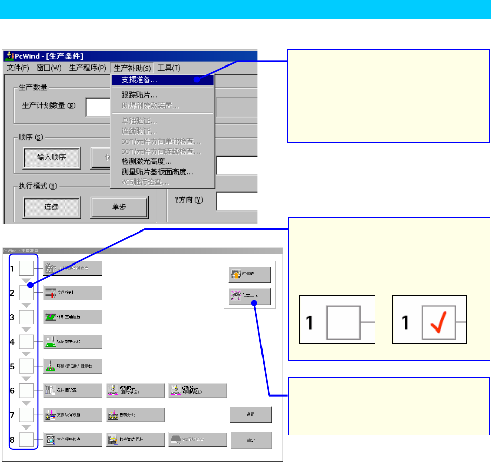 可以使用「支援准备」功能,一边确认步骤,一边进行生产准备。