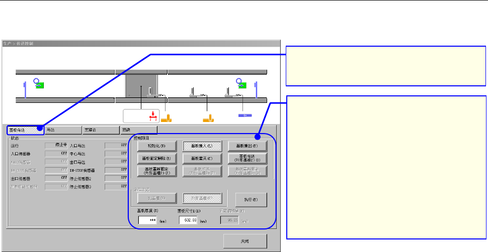 操作手册 Step5 - 2 在基板搬送画面上 执 行基板搬出。 请确认是否保持与生产时的动作同步传送基板,传送动作是否有问题。 2. 把基板安装在 IN 缓冲,确认连续动 作时基板流动是否顺畅。 选择 [ 基板搬入 ]-[ 执行 ] 后 , 基板即可搬 入、夹紧。 选择「基板搬出」 - 「执行」 后,基板即可 搬出 。 1. 按下「基板传送」按钮 , 即显示「基 板传送」画面。 3- 12