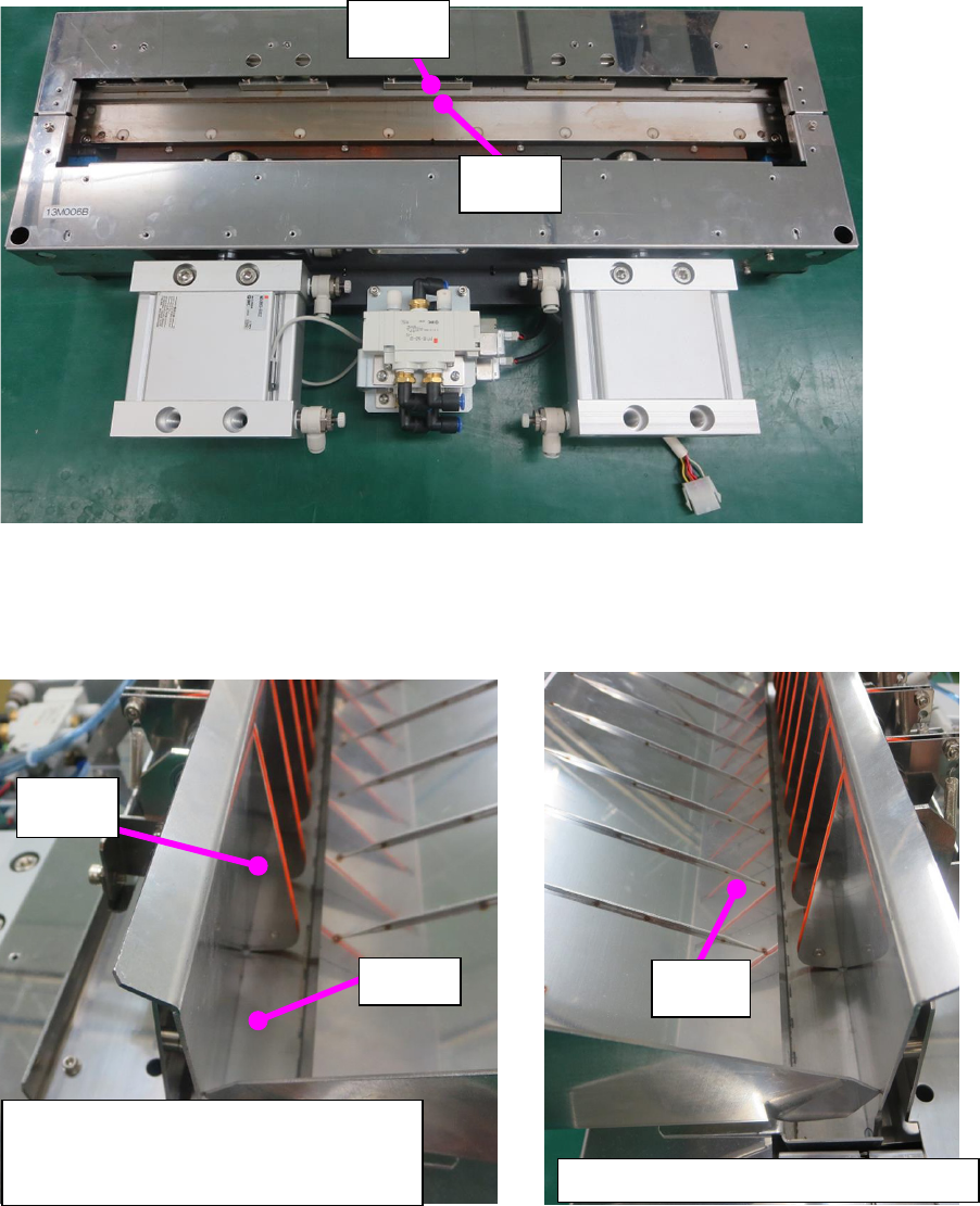 操作手册 10 )更换切带单元 11 )请将切带部分导轨安装到更换用的切带单元上。 可动刀 固定刀 12 ) 请将下部排出导轨安装到更换用的切带单元上。 13 ) 请将更换用切带单元安装到装置上。 14 ) 请将插在汽缸上的气管塞子拔下,连接电磁阀与汽缸。 并将从装置延伸出来的线缆接头插在切带单元一端的接口上。 15 ) 如果是固定台架规格,请安装上部排出导轨。 16 ) 安装更换用的切带单元后,请将剩余的气管塞子插在拆下的切带主机的汽…