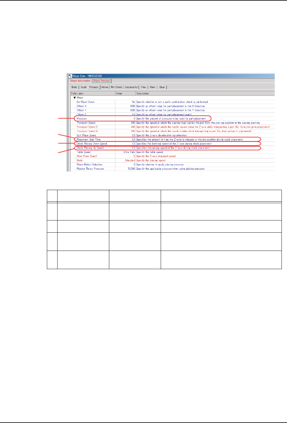 PRG-NXTS-004S0 2. Job 编制器 NXT 系列 编程手册 113 Shape 数据 的设定 1. 从 Job 信息栏中选择 [Shape Data] 标签页。 2. 双击元件的外形数据名。显示外形数据设 定。 3. 选择 [Shape Process] 标签 页,然后选择 [Process] 标签页。 4. 进行以下的设定。 *1:在吸嘴下降端,贴装时发生 冲击负荷。在 [Stack Placing Down Spee…