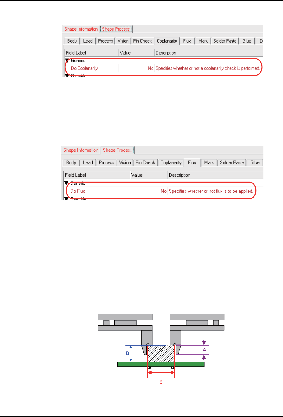PRG-NXTS-004S0 2. Job 编制器 NXT 系列 编程手册 119 9. 请 在 shape 数 据的 [Shape Pro cess] 中将 Coplanarity 设 定为 [No]。 10.请在 shape 数据的 [Sha pe Process] 中将 Flux 设定 为 [No]。 实施用爪压下元件时 用爪压下元件时,通过接触面或 爪顶端进行压下动作。 通过接触面压下时 通过接触面实施压下时,请在外 形数据中进…