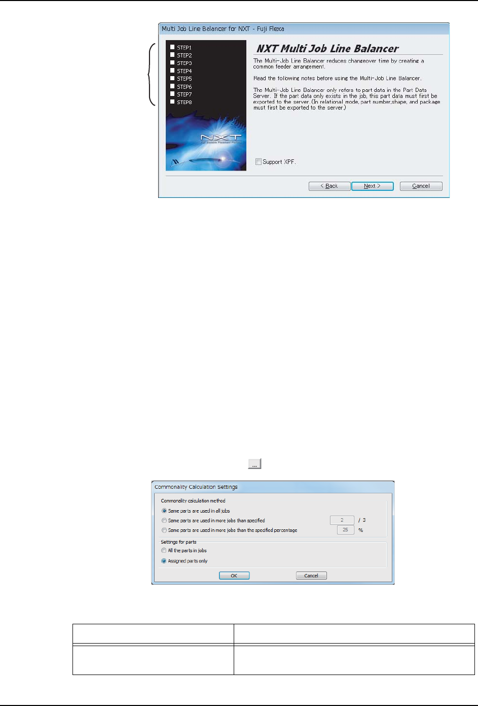PRG-NXTS-004S0 2. Job 编制器 NXT 系列 编程手册 145 3. 如果生产线上存在 XPF 时,请选择 [ 支持 XPF] 的设定。如果不存在 XPF 或者在生产线 平衡中不考虑 XPF 时,请不要选择该选项。 4. 单 击 [Next]。 5. ST EP1,请单击 [[A dd]。显示 Job 的选择对话框。 6. 使用该对话框选择要执行多 Job 生产线平衡的 Job。 备注 )使用 [Ctrl] 或 [S…