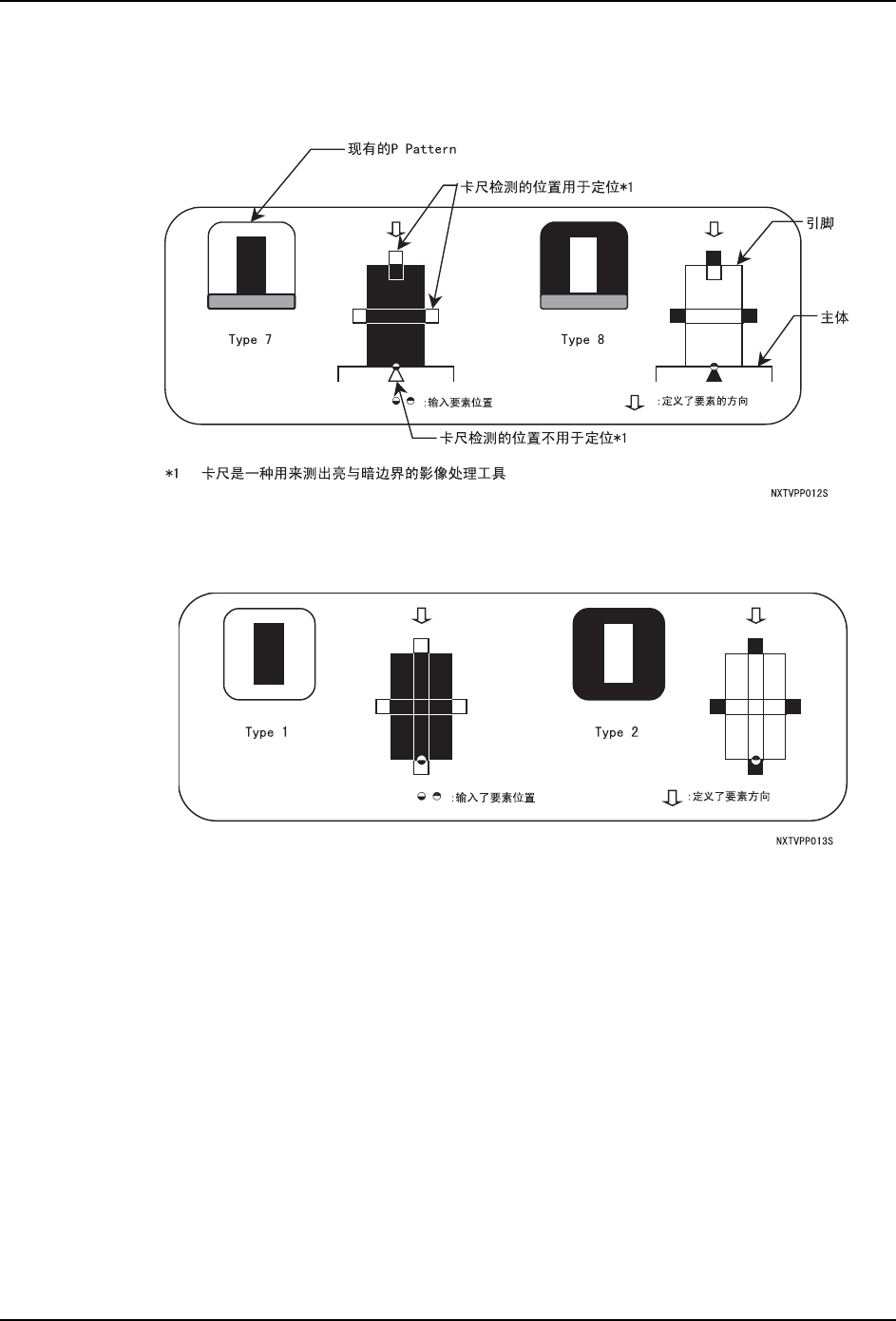 PRG-NXTS-004S0 3. 元件数据 NXT 系列 编程手册 195 3.5.2 P Pattern 的详细内容 [ 图形说明 ] 备注 )卡尺是一种通过影像的明暗检物体边缘的影像处理工具。 Type 1,2 因为引脚和元件主体的所有边缘 被清楚地显示, 所以卡尺测量引脚的全部 4 个方向, 使用该 检测结果将进行元件的位置检测 。 Type 1 时,引脚为黑 色,引脚周围为白色。 Type 2 时,引脚为白 色,引脚周围为黑色…