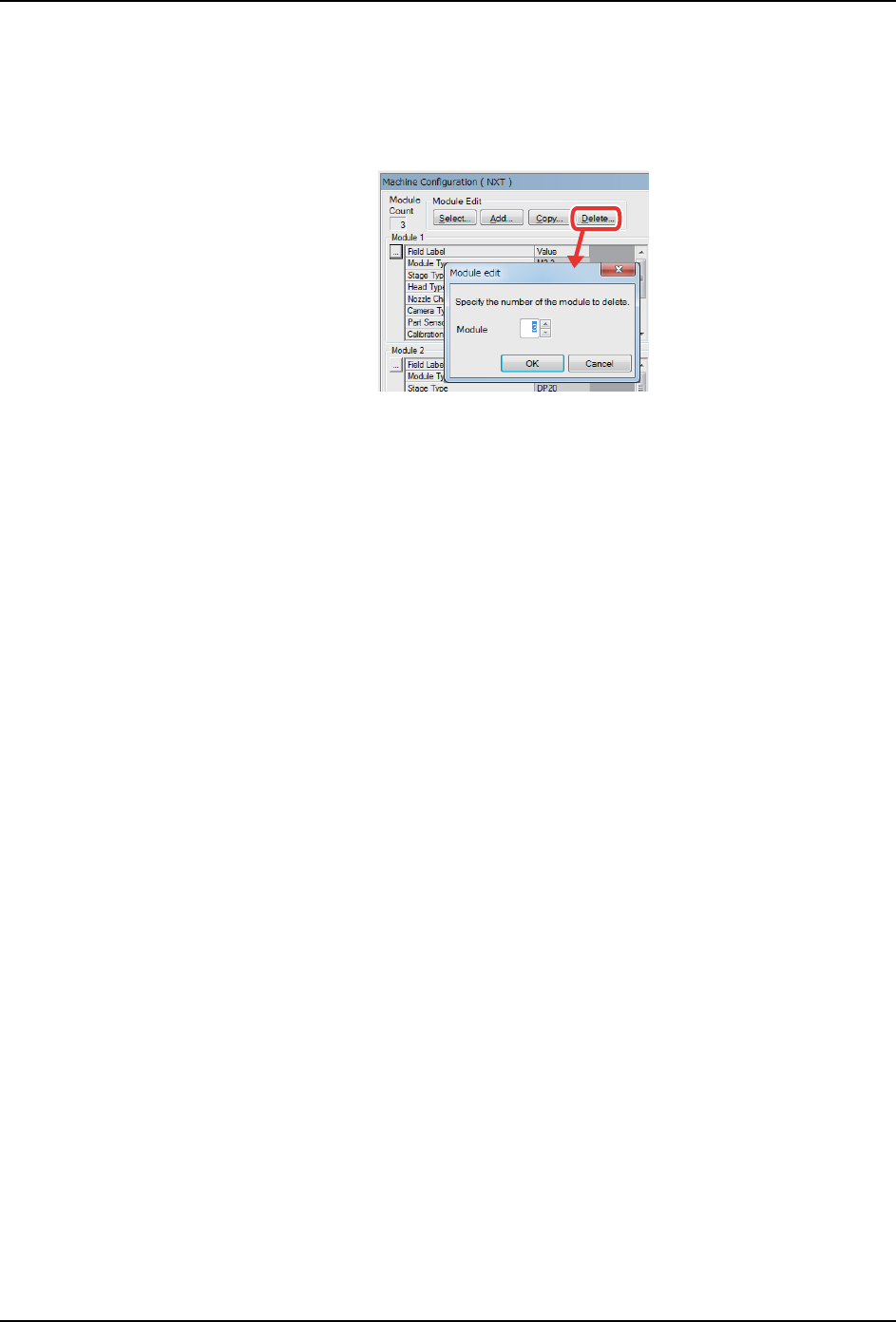 2. Job 编制器 PRG-NXTS-004S0 24 NXT 系列 编程手册 6. 要把在 Job 设定的模组配置注册为标准设定时,执行 工具栏的 [ 文件 ]-[ 机器环境反映 为标准值 ]。 7. 删 除机器时,在 [ Module Edit] 群 组点击 [Delete] 。在 [Delete Ma chine] 对话框 选择 删除机器的编号,点击 [OK]。 01PRG-0307E