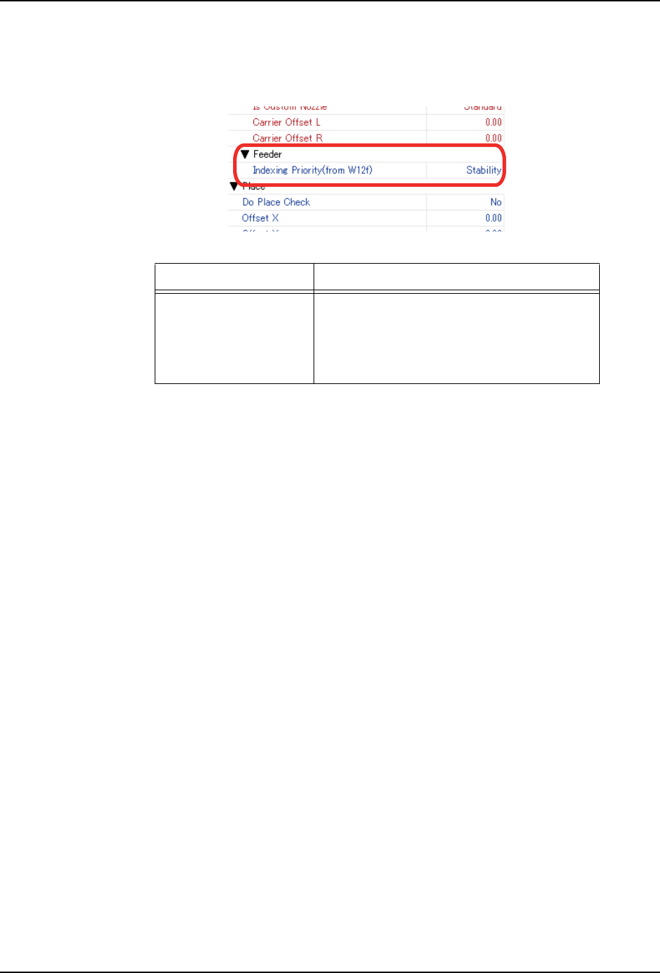 PRG-NXTS-004S0 2. Job 编制器 NXT 系列 编程手册 43 稳定。发现供料 姿势不稳定时请设 定为 [Stabilit y]。 ·[Indexing Priorit y(from W1 2f)] 的设定仅在封 装数据 [Inde xing S peed] 设定 为 [High] 时有效。 ·[Indexing Prior ity(from W12f)] 的设定仅对 W12 f 以上的供料器 有效。