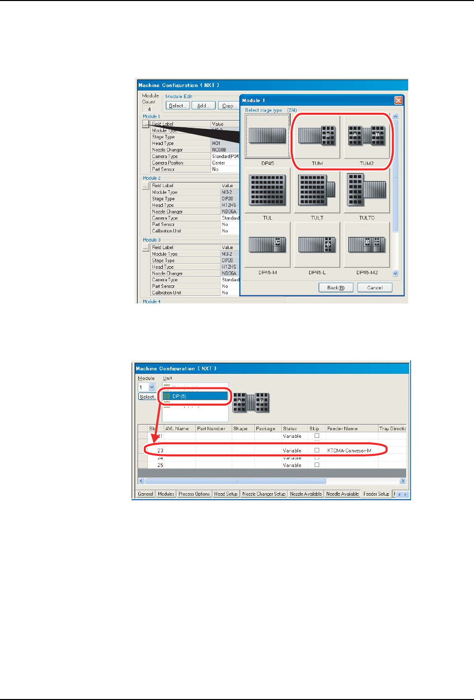 PRG-NXTS-004S0 2. Job 编制器 NXT 系列 编程手册 61 Job 的设定 1. 在 Job 编制器的 [Machine Config uration]-[Modules] 标签页内,请指定 搭载了料盘单 元 -M 的模组的 [Stage Type]。 (详细内容参 照 "2.4.1 搬运轨 道和优化的设定 "。 ) 2. 如果要使用 2 台料盘单元 -M,请选择料站托架 (DP(5)) ,将不…