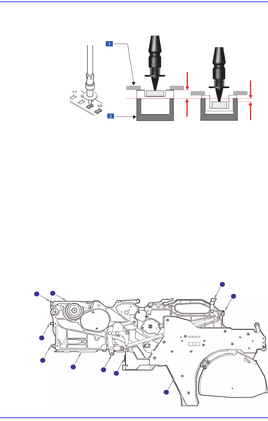 6-23 Module Function 1: 테이프 가이드 2: 프레임 테이프 피더의 종류에 따라 흡착점의 Z 값이 다양하게 적용됩니다 . 또한 , 부품 공급 테이프의 종류에 따라서도 그 값이 다른데 , Embossed T ape 의 경우 Paper Ta p e 의 경우보다 높이를 더 낮게 설정해야 합니다 . Embossed T ape 의 경우 , 부품 테이프의 규격을 참조하여 적절하게 흡착점…