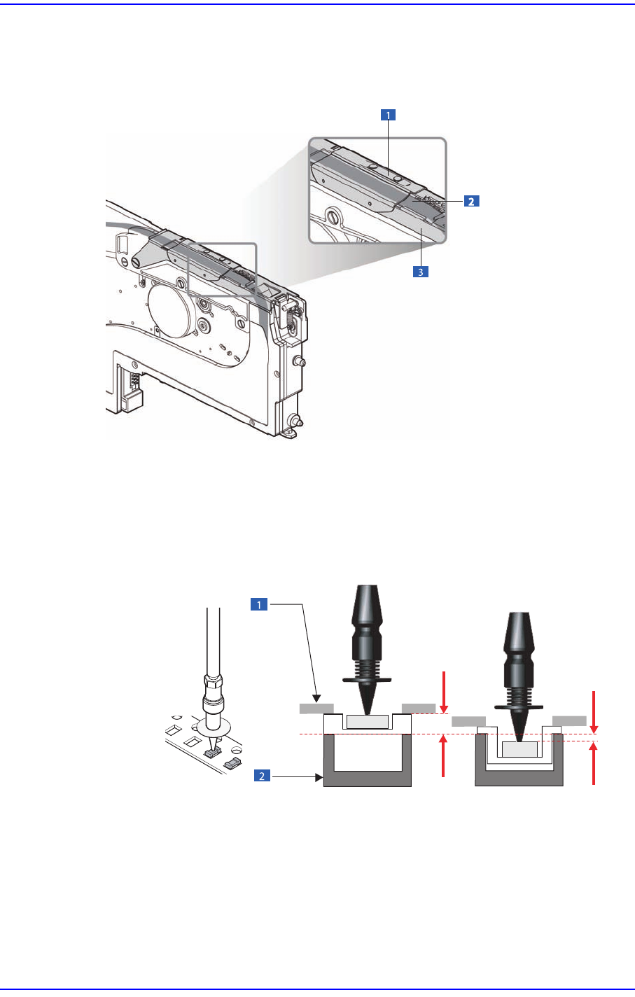 6-27 Module Function 의 상면 ) 입니 다 . 그러므로 , 흡착 위치에서 Z 축 높이 는 부품의 크기와 전송 테이프의 두께에 따라 달라집니다 . 1: 테이프가이드 2: 테이프 3: 프레임 1: 테이프 가이드 2: 프레임 테이프 피더의 종류에 따라 흡착점의 Z 값이 다양하게 적용됩니다 . 또한 , 부품 공급 테이프의 종류에 따라서도 그 값이 다른데 , Embossed T ape…