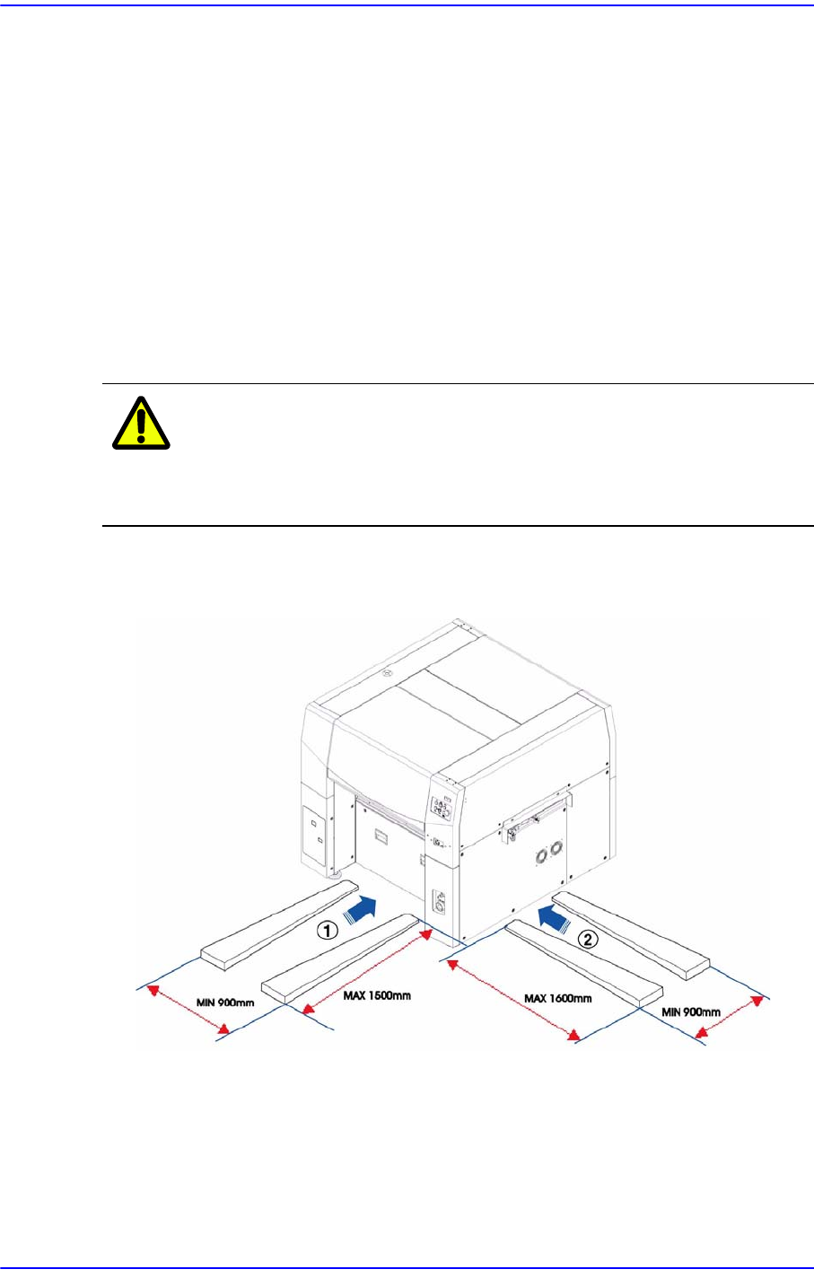 4. 다음의 그림을 참조하여 지게차의 리프트 암(Fork) 폭을 조정하여 장비를 이동