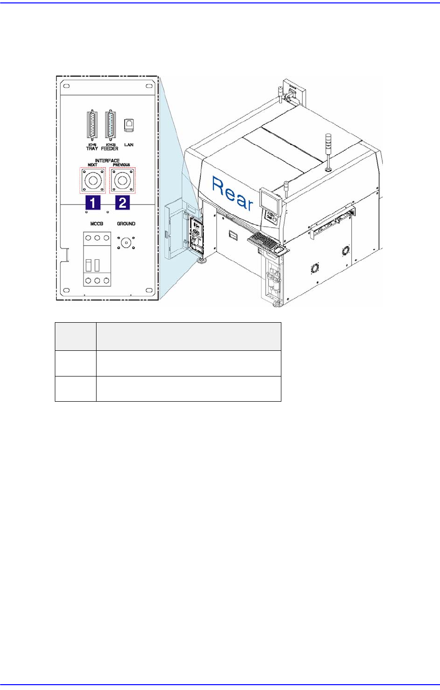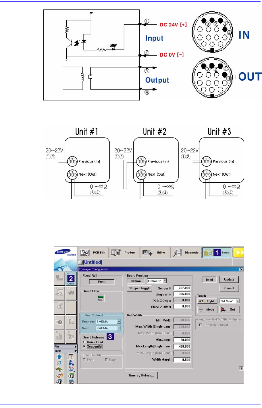 7-20 Samsung Compon ent Placer SM411/411N Introdu ction 7.1.7. 장비간의 통신 Interface 설정 전공정 장비 (Previous Machine) 와 후공정 장비 (Next Machine) 간의 통신 Interface 를 다음의 사항을 참조하여 실시하십시오 . ST AR T 입력신호 (Cable No.: ① (+), ② (-)) 입력신호는…