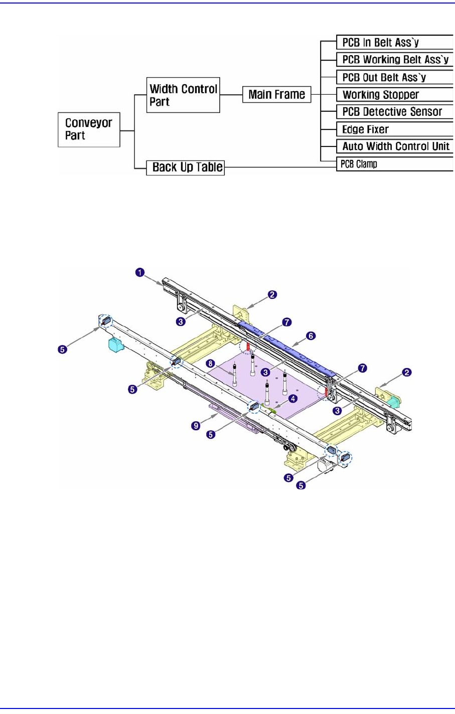 6-3 Module Function 그림 6.3 PCB Conveyor System 구성도 6.3.2. 기능 각 구성 요소별 기능은 다음과 같습니다 . 그림 6.4 PCB Conveyor Module 1: Main Frame 2: Conveyor W idth Contr ol Unit 3: PCB Belt Assembly(In, W orking, Out) 4: Place S topper 5: …
