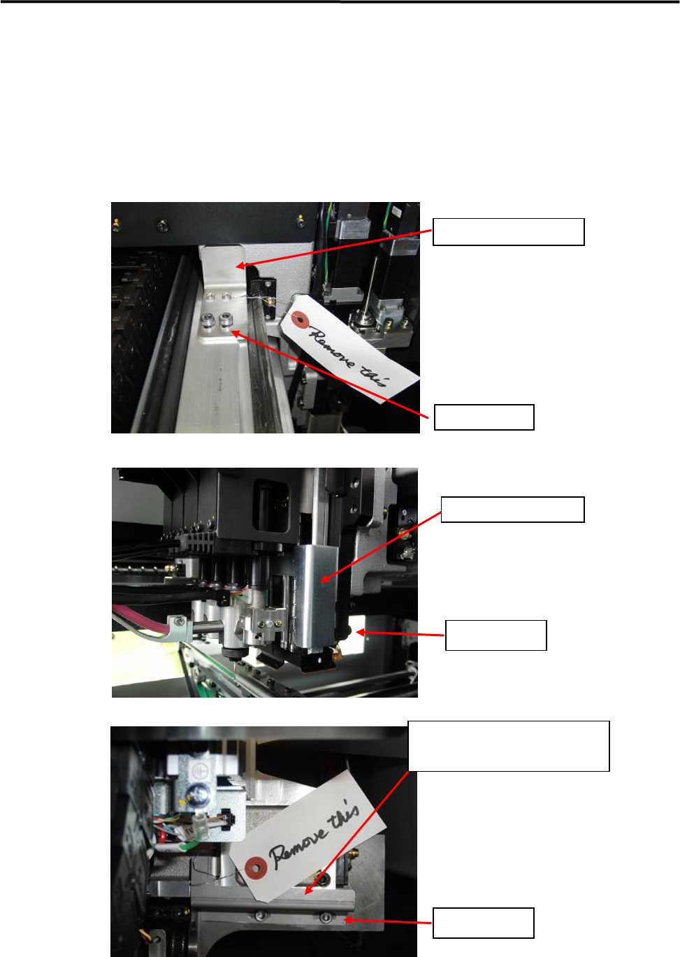 1 Installation 1-6 ACTION: ① Locate the unit to th e specified place. ② Remove the followings: the b olt that locks the head in the X-axis beam and the metal fitting that prevent X-axis beam movement to the Y direction. …
