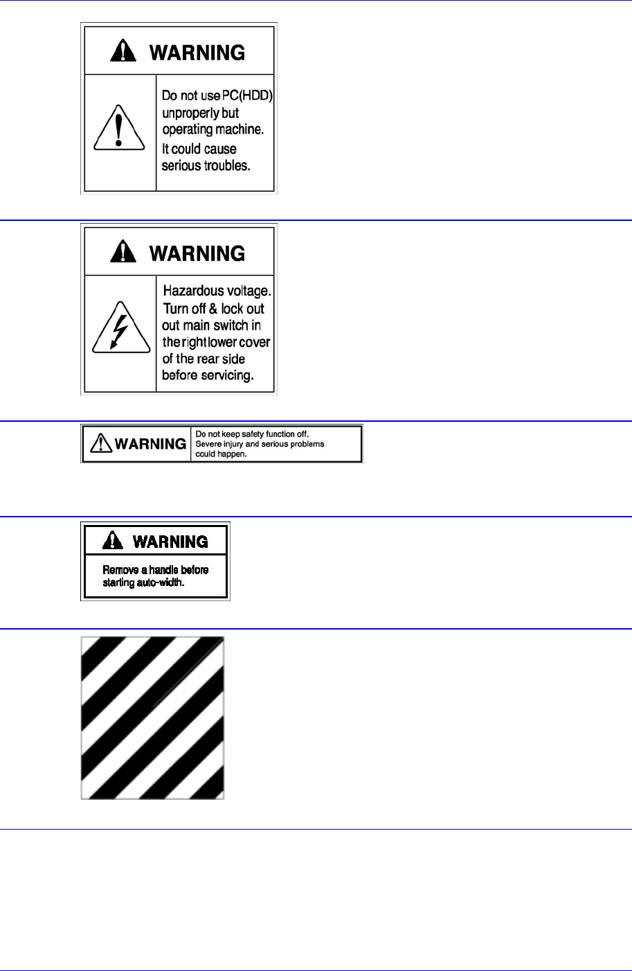 Pr eface v  Rear V iew of the Machine The following labels are attached on the rear part of this machine. Figur e 0-2. Safety labels attached on t he rear part of the machine Do not put a hand in during operation. Part …