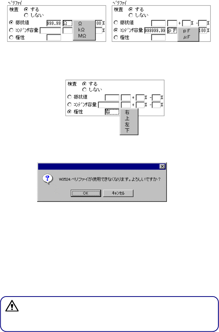 4 - 82 ③ ベリファイ 抵抗値、容量、極性を検査するか否かをラジオボタンで設定します。 「抵抗値」または「コンデンサ容量」を指 定した場合は、判定値・ 単位・許容誤差 の上限/下限を入力してください。 単位の入力は、入力領域でトラックボール の右ボタンをクリックす ることにより下 図のようなポップアップメニューが表示されます。 ◇ 極性を指定した場合は、入 力領域でマウスの<右>ボ タンをクリックすることにより 方向が選択できます…
