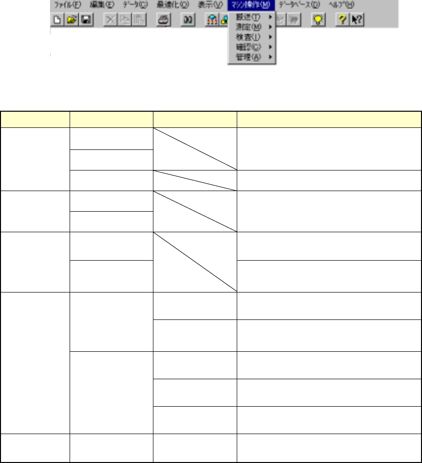 4 - 152  4-12. マシン操作 マシン操作 マシン操作 マシン操作 本体を実際に動作させて行う各種作業を実行します。各作業毎にメニュー項目がわかれています。 以下に各メニュー項目のサブメニューおよび機能概要を示します。 メニュー項目 メニュー項目 メニュー項目 メニュー項目 サブメニュー1 サブメニュー1 サブメニュー1 サブメニュー1 サブメニュー2 サブメニュー2 サブメニュー2 サブメニュー2 概要 概要 概要 概要 …