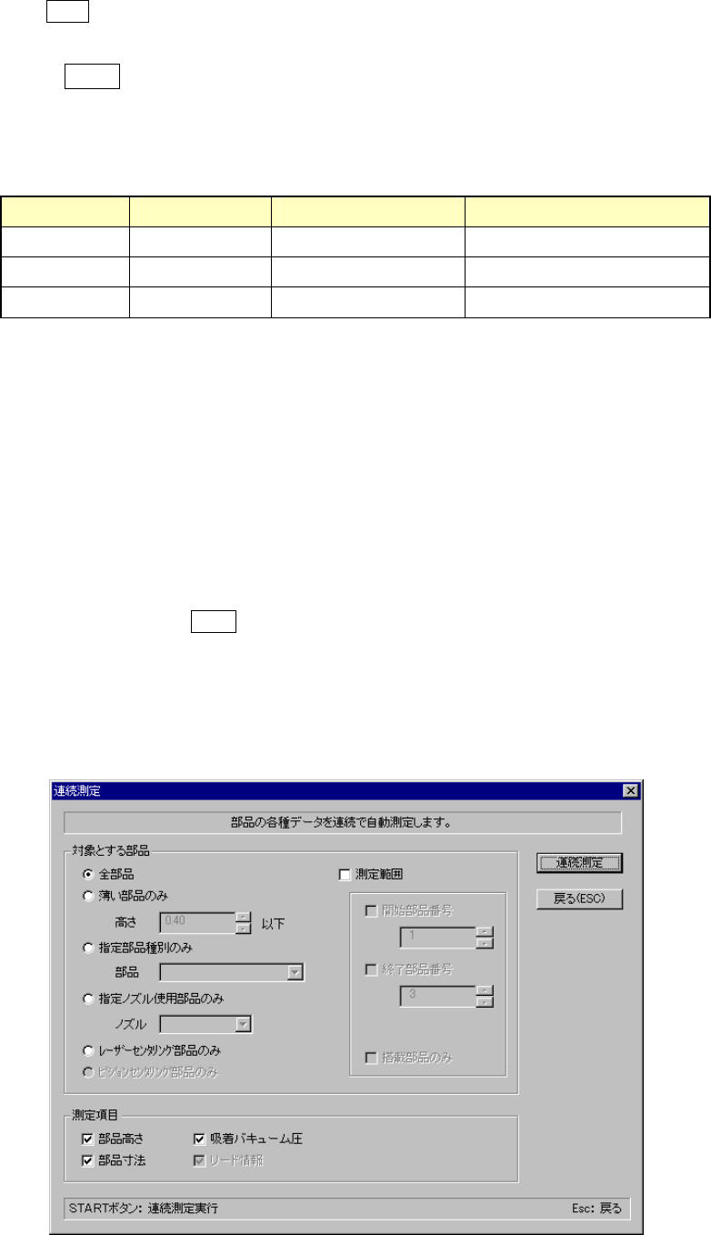 4 - 169 1) 対象とする部品 部品データの中からある条件に一致した部品だけを測定する場合に設定します。 ① 全部品 すべての部品データを測定します。 ② 薄い部品のみ 部品高さがエディットボックスに設定された以下の値の部品のみ測定します。 ③ 指定部品種別のみ コンボボックスに選ばれた部品種別のみ測定します。 ④ 指定ノズル使用部品のみ コンボボックスに選ばれたノズルを使用する部品のみ測定します。 ⑤ レーザセンタリング部品…