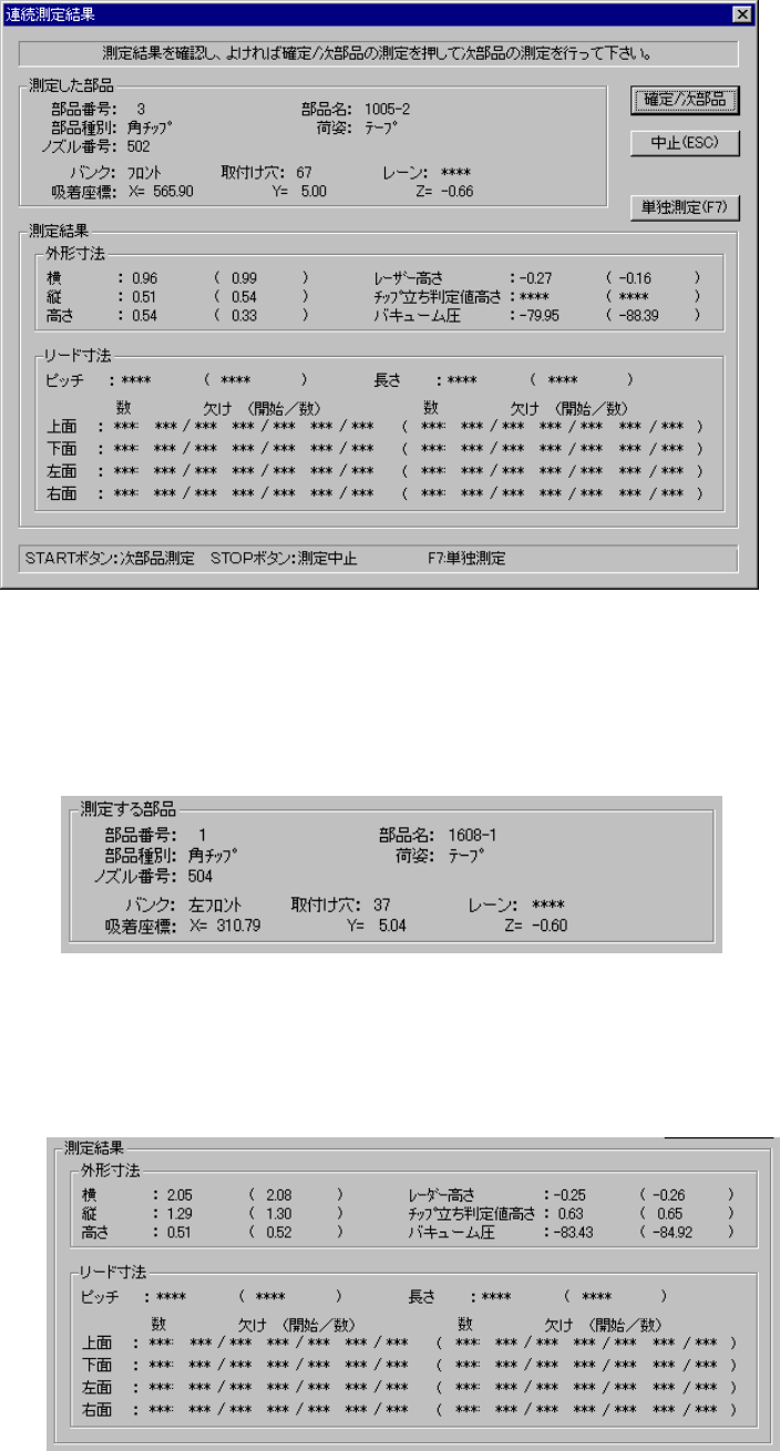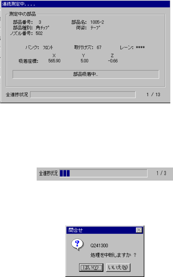 4 - 171 (2) 連続測定中画面 連続測定実行中は以下のダイアログが表示されます。連続測定を行っている部品の内容および吸 着位置が表示され、逐次実行中の処理内容を表示していきます。 図 図 図 図 4-12- 2-4-3-3 連続測定中ダイアログ 連続測定中ダイアログ 連続測定中ダイアログ 連続測定中ダイアログ 1) 全体進捗状況 現在の進捗状況をプログレスバーで表示します。 強制的に中止する場合 は<ストップ>ボ タンを押す…