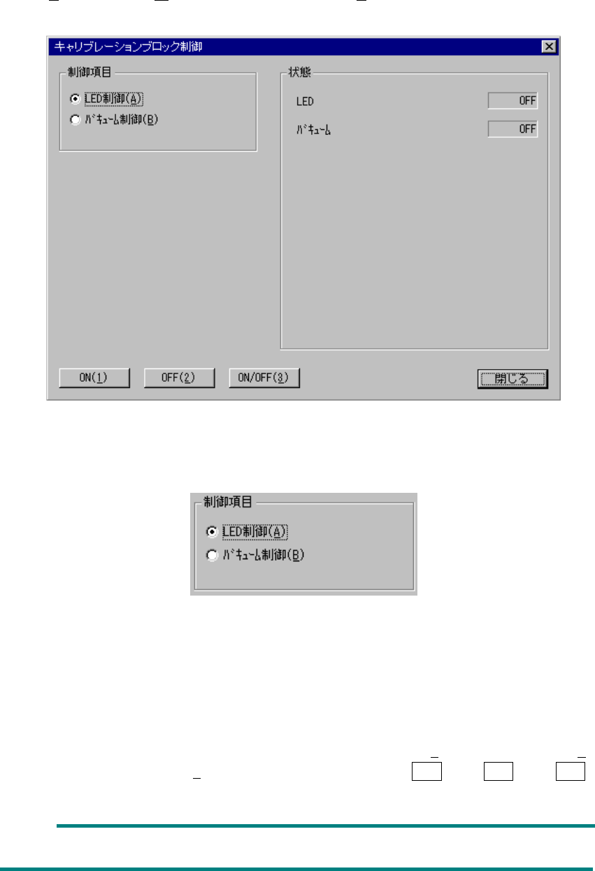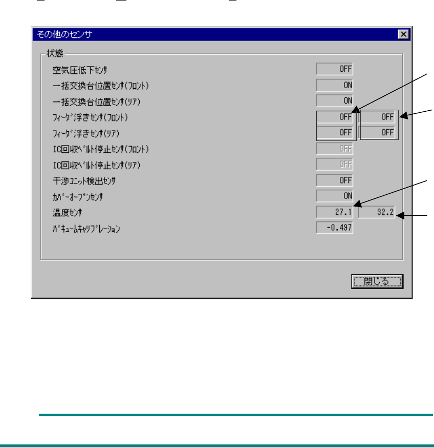9 – 56  3) バキューム制御 バキュームの ON / OFF を制御します。 ・制御項目の“バキューム”がチェックされているときに< ON ( 1 )>ボタン、< OFF ( 2 ) >ボタン、< ON / OFF ( 3 )>ボタンを選 択す る かまたは、 F3 キー、 F4 キー、 F5 キ ー、を押して制御します。 ・状態表示は、制御完了時に更新されます。 (3) 状態表示 各ユニットの状態を制御完了時に表示します。 …