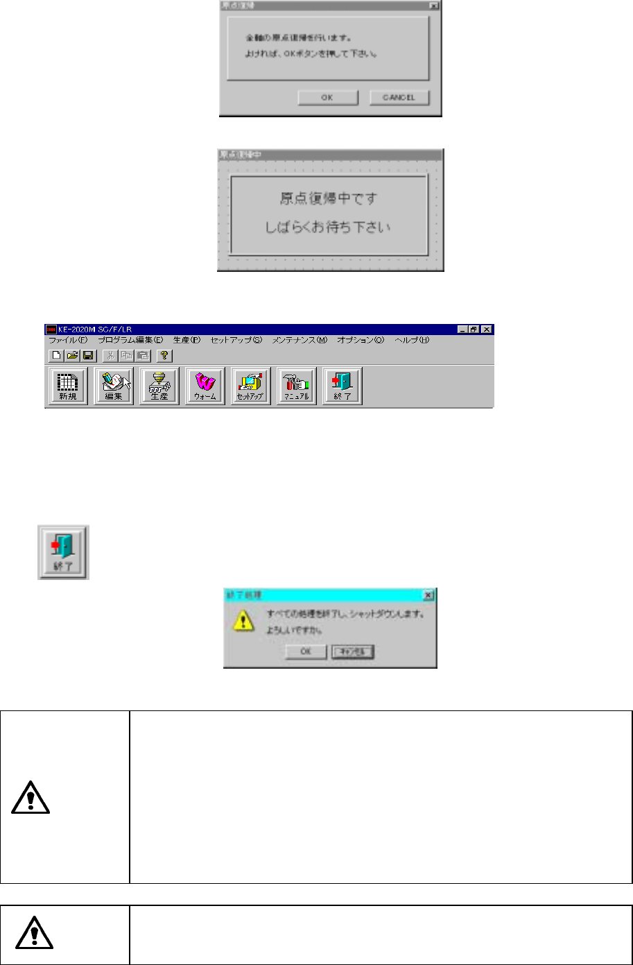 3 - 13 暫くして, 初 期化が終了し ますと, 原点復帰画面が表示されま す。 ここで , 原点 復帰を行わない 場合には, <CANCEL> ボタン を押下し て下さい。 また, 原点復帰が完了すると, メインメニュー画面 が表示されま す。 図 図 図 図 3-4- 2 原点復帰ダイアログ 原点復帰ダイアログ 原点復帰ダイアログ 原点復帰ダイアログ 図 図 図 図 3-4- 3 原点復帰完了待ちダイアログ 原点…