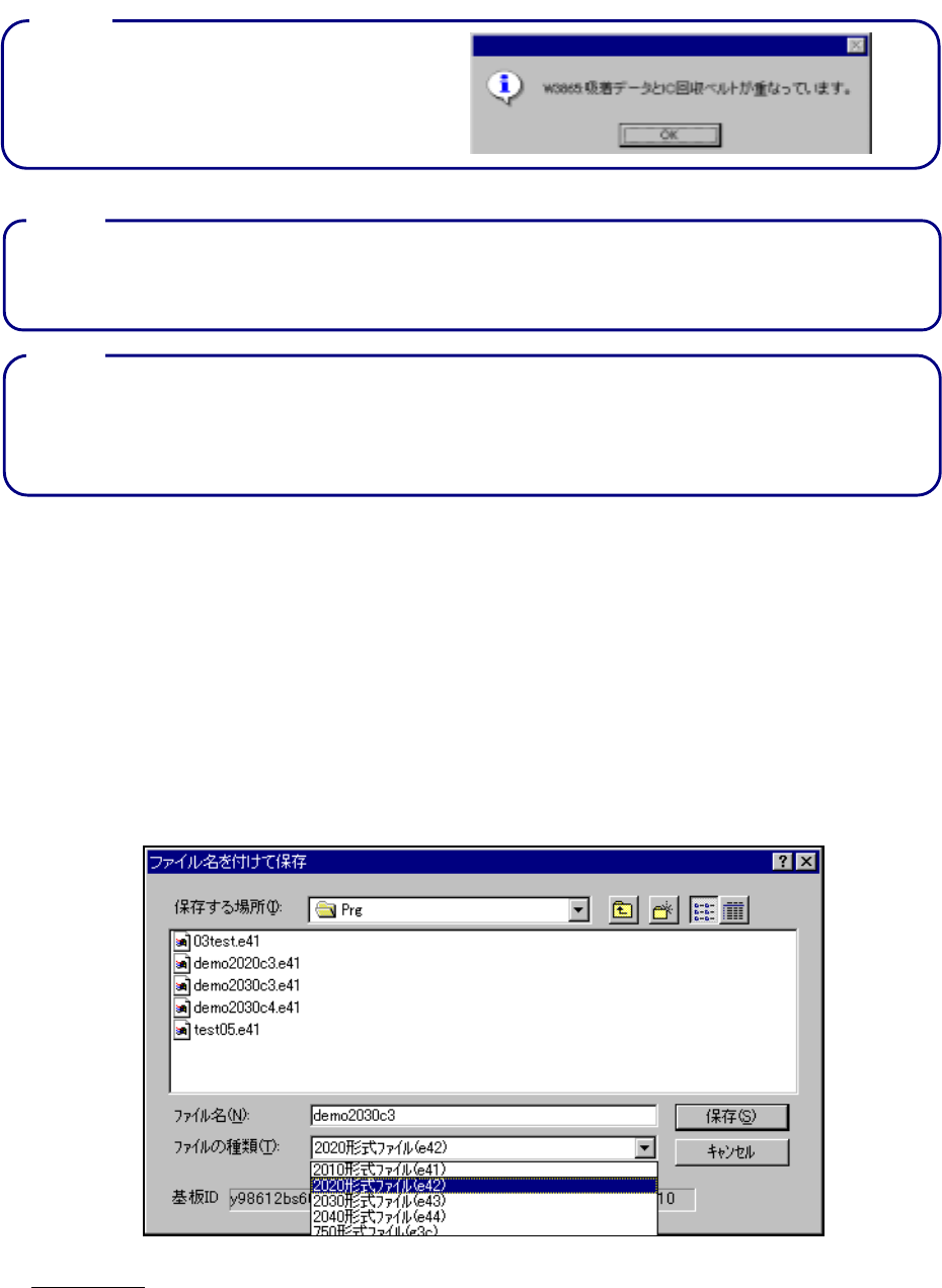 4 – 8 ファイルの読み込み時に,吸着データと IC 回収ベルトの重なりをチェックし,ワ ーニングメッセージを表示します。 ファイル読み込み時に,ビジョンデータ及び接着データ関連のデータは読み込めません。 読み込むデータにこれらのデータがあった場合,データが入りません。 部品データの,ビジョン,接着データは,変更されます。 他機種の生産プログラムファイルを読み込んだ場合、機種によって基準になる座 標が異なるなどの 理由から、吸着デ…