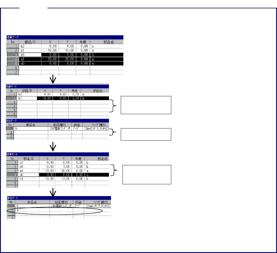 部品 a が搭載 a1 と a2 に、部品 b が搭載 b1、b2、b3 に関連付けられているケースを例に解説します。
