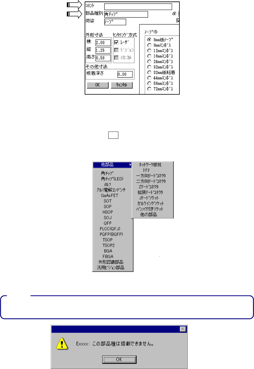 4 - 56 ③ 部品荷姿 部品荷姿 部品荷姿 部品荷姿 トラックボー ルの〈右 ボタン〉 又は、 F2 キーを 押下する と、下図のよ う に 部品 荷姿 の ポ ップアップメニューが表示されます。 本項目が確定すると入力された荷姿に応じて荷姿のウィンドウがオープンします。 トレイは選択できますが、最適化をすることができません。 1) テープが設定された場合のタックコントロール部 ピッチは、テープ巾の設定後、設定されたテープ巾で指定で…
