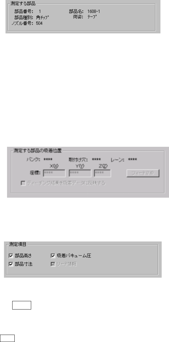 4 - 164 1) 測定する部品 測定する部品の内容が表示されます。 2) 測定する部品の吸着位置 部品を吸着する吸着位 置の内容が表示さ れます。前代替部品や次代 替え部品へ吸 着位置を変更 することもできます。吸着 データがない場合は各 項目は非表示とな り、吸着位置の変更、フ ィ ードノック、ティーチングはできません。 ① フィード フィーダを一回ノックし部品を送ることができます。( 32mm 紙テープは除きます) ② ティ…