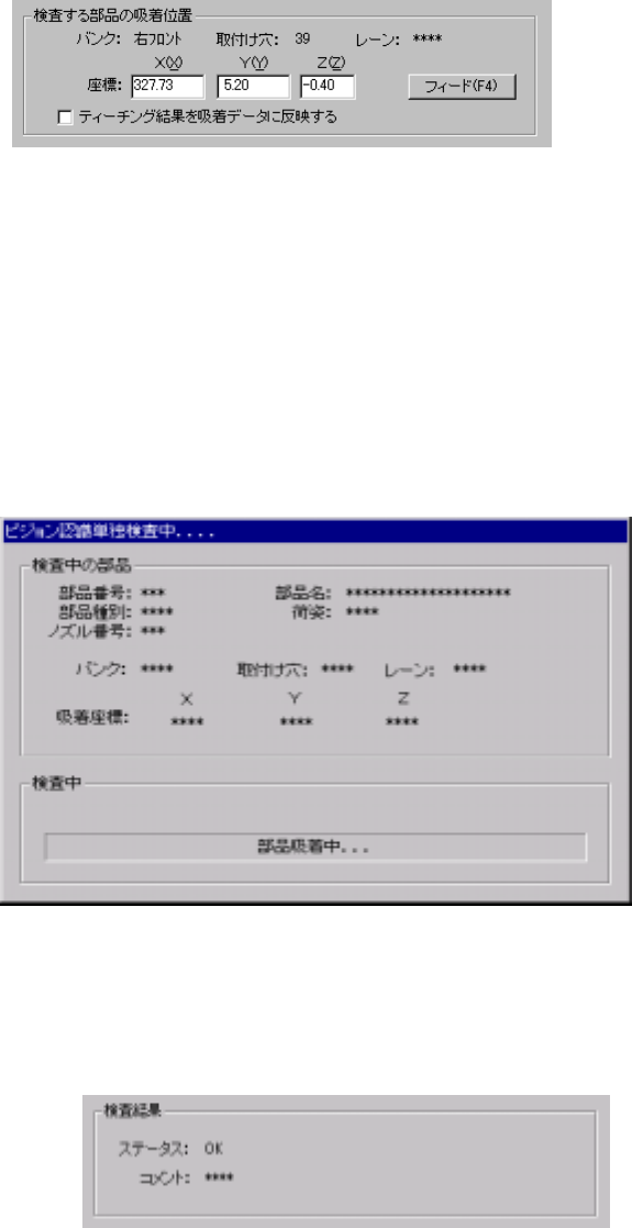 4 - 178  3) 検査する部品の吸着位置 部品を吸着する吸着位置の内容が表示されます。 前 代替部品や次代替部品へ吸着位 置を変更することもで きます。吸着 データがない 場合、または MT C の場合は各項目は 非表示となり、吸着位置の変更、フィードノック、ティーチングはできません。 図 図 図 図 4-12- 3-4-5 検査する部品の吸着位置 検査する部品の吸着位置 検査する部品の吸着位置 検査する部品の吸着位置 ① フィ…