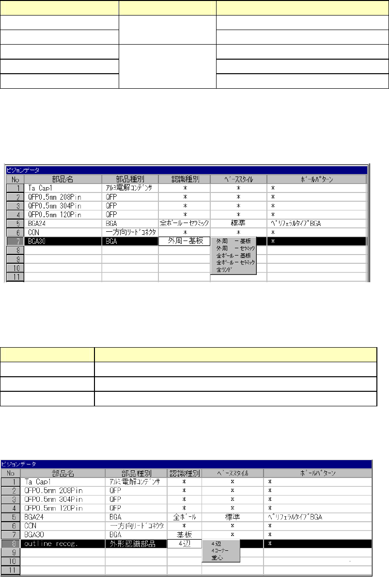 5 – 22 ⑪ ⑪ ⑪ ⑪ 認識種別 認識種別 認識種別 認識種別 “ BGA のピン(ボール)とモールド部とのコントラストの設定”または、“外形認識部品の認 識パターン ”を設定します。 1) 1) 1) 1)BGA BGA BGA BGAの場合 の場合 の場合 の場合 ● 設定項目 表 表 表 表5 5 5 5- - - -2 2 2 2- - - -3 3 3 3- - - -1 1 1 1 ポップアップメニュー 認…
