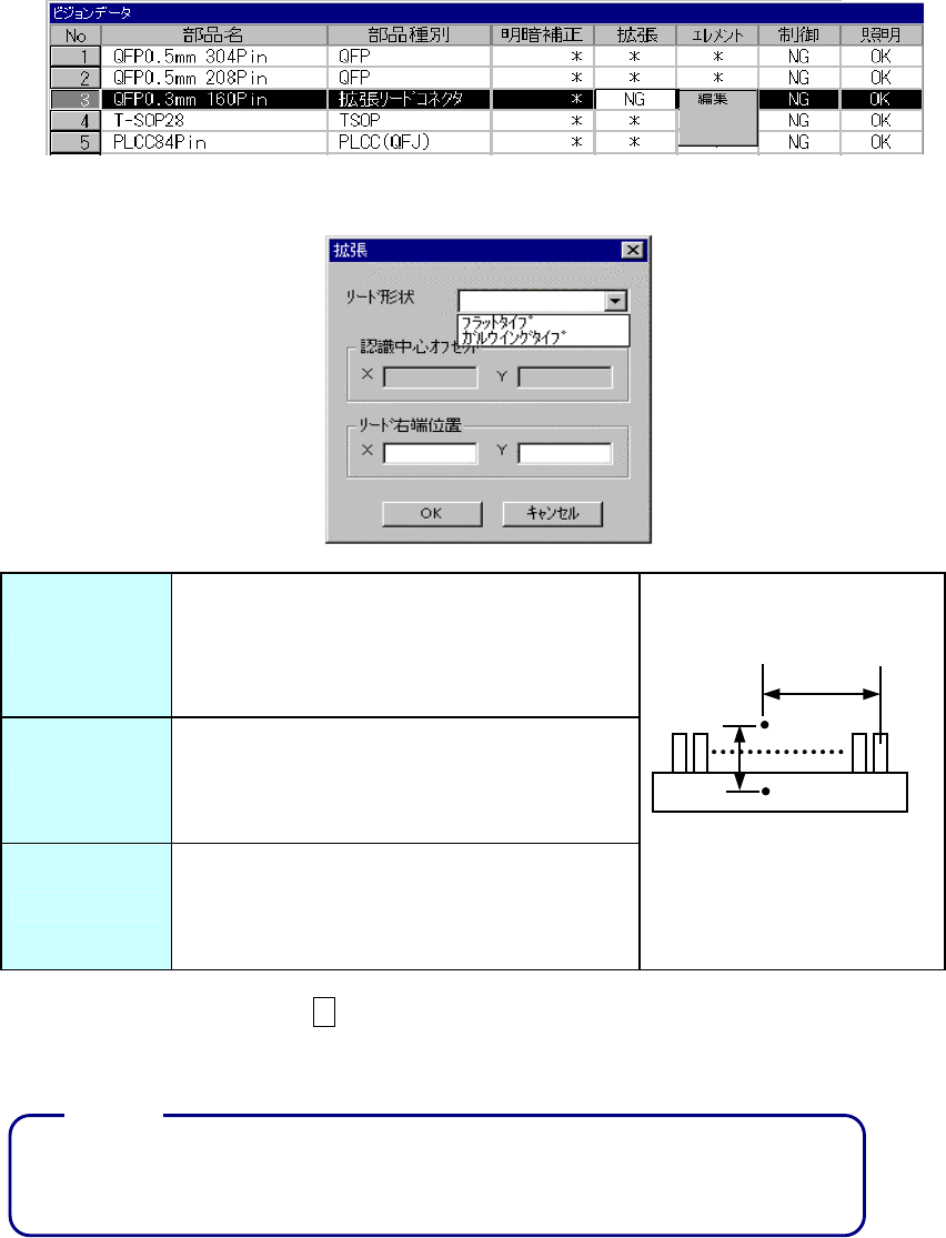  5 – 43 ⑲ ⑲ ⑲ ⑲ 拡張 拡張 拡張 拡張 拡張では、拡張リードコネクタ部品を設定する場合に使用します。 一方向リードコネクタが対象になります。  〈右〉クリックで選択ポップアップが表示されます。    ● 編集をクリックすると以下の画面が表示されます。     リード形 状 リードの形状を設定します。 ・フラットタイプ ・ガルウイングタイプ デフォルトではフラットタイプが選択され…
