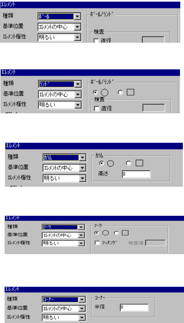 5 - 50 3-5. エレメント エレメント エレメント エレメント エレメントグループ又は拡張アレイの「エレメント」を追加又は編集をクリックすると以下 の画面が表示されます。 ・検査するリード(ボール)の条件設定を行います。 ● さらに、エレメントの種類を選択すると以下のよう画面が上のダイアログの 右側に表示されます。 (1)アウターリードまたは、インナーリードを選択した場合