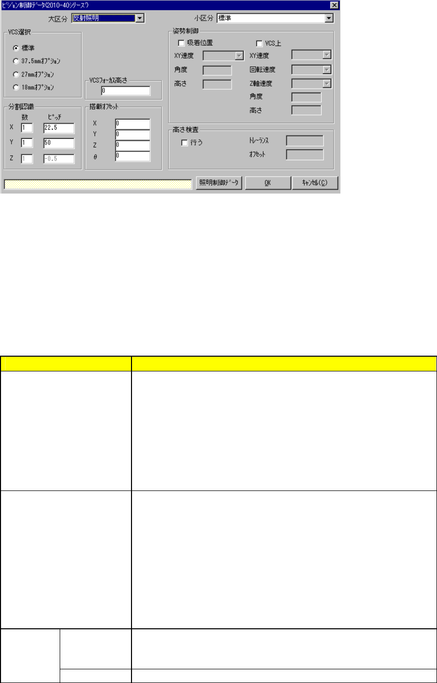 5 - 84 認識 VCS 認識 VCS を選択します。  標準 (5 0mm)  37.5m m オプション  27m m オプション  18m m オ プション VCS フォー カス高さ VCS が認識する高さを指定します (部品底面から リード 下面までの寸法) 搭載 オフセット X,Y ,Z, θ 搭載上での部品毎のオフセットです。部品 データの 認 識 オフセット と同じ機能 ですので使用時注意して下さい。 吸着位…