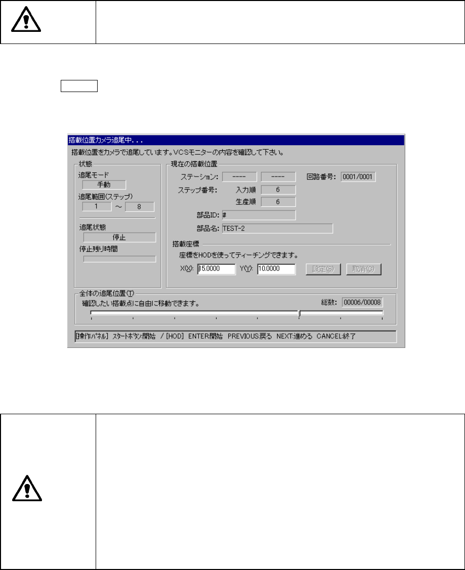 7 - 100 ② 搭載位置の変更 停止状態であれば, HO Dの CAM ERA キーを押す ことにより搭載位 置のティー チングが出来 ます。 また,直接テンキーから搭載位置を変更することも出来ます。 手入力からでも, 修正値を 入力することが 出来ます。 入力可能範囲は , ソフトウ ェア範囲まで です。入力後,設定ボタンを押した時点でヘッドが移動しますので注意して下さい。 注意 人身への損害を 防ぐため ,HOD 操作中…