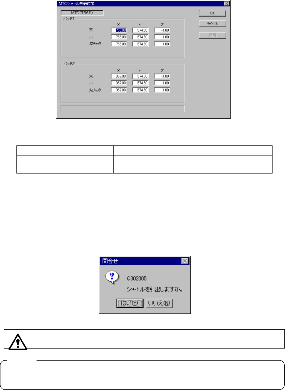 MTCシャトル吸着位置の設定ダイアログMTCシャトル吸着位置の設定ダイアログ