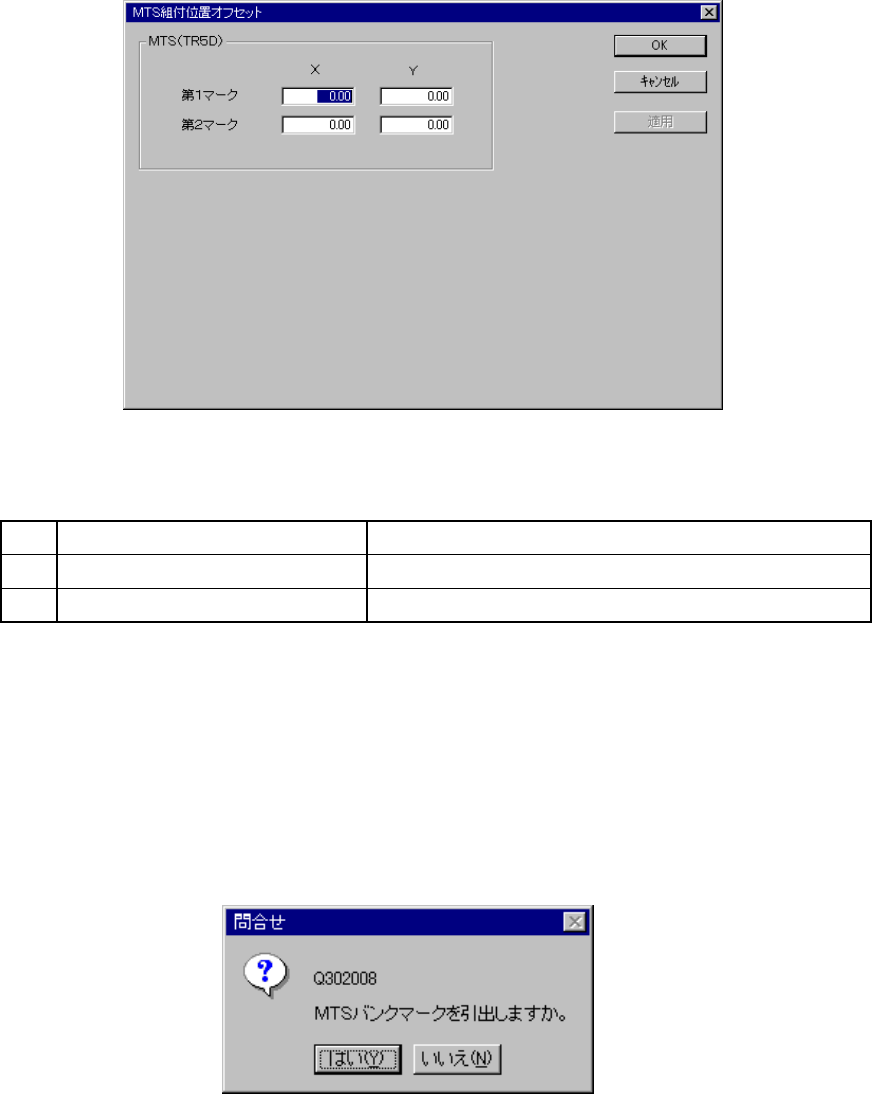  8 - 23 8-2-2-6. MTS組付位置オフセット MTS組付位置オフセット MTS組付位置オフセット MTS組付位置オフセット MTS組付位置オフセットを選択すると、図 8-2- 2-6-1 のMTS組付位置オフセット設定のダイア ログが表示されます。   図 図 図 図 8-2-2- 6-1 MTS組付位置オフセ MTS組付位置オフセ MTS組付位置オフセ MTS組付位置オフセットの設定ダイアログ ットの設定ダイアログ…