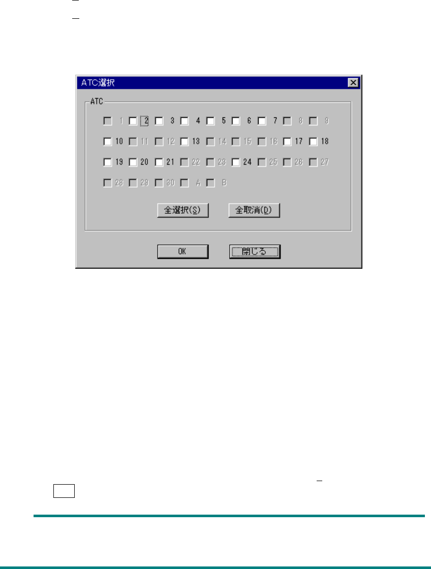 9 – 49  ● ノズル交換が選択されると、図 9-6-1-2 の AT C 番号選択ダイアログが表示されます。 ・ <全選択( S )>ボタンを選択すると、選択可能な AT C が全て選択されます。 ・ <全取消( D )>ボタンを選択すると、全ての AT C 選択が取り消されます。 ・ ノズルを交換する AT C 番号をラジオボタンにより選択して< OK >ボタンを選択すると、 選択 した AT C 番号によりノズル交換を行いま…